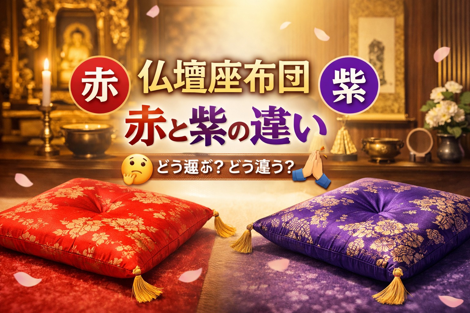 仏壇座布団の赤と紫は、どちらが絶対正解というより、場の雰囲気と心配りで選ぶものです。一般的には、紫は法要など厳かな場面で選ばれやすく、赤は普段の手合わせや仏間を明るく見せたいときに選ばれやすい傾向があります。