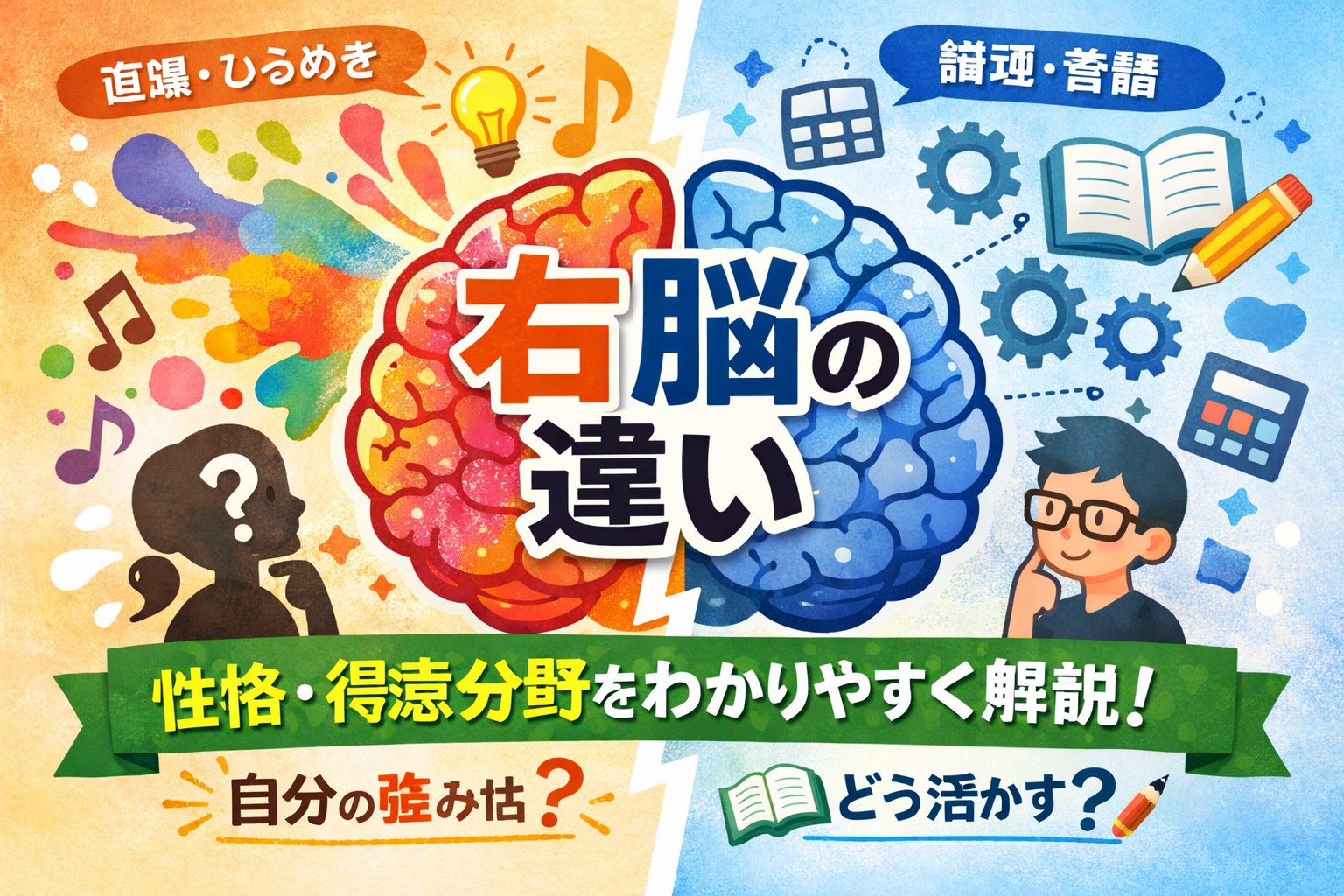 右脳 左脳 違いとは、右脳がイメージや直感、左脳が言語や論理に関わることが多いという 得意分野の傾向の違い です。