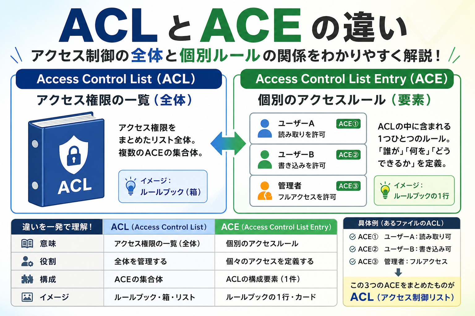 - ACLE(Access Control List Entry): そのACLというリ ストの中に含まれる、「具体的なルールや設定項目の一つ一つ」 。つまり、ACLを構成する最小単位の要素です。